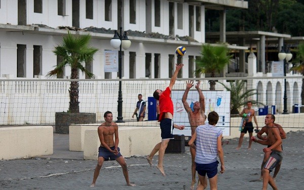 Вместе впадения реки Сочи в прошлом году уже были установлены деревянные раздевалки, душевые кабинки, металлические стойки для волейбола, кадки с хилыми пальмами, вонючий биотуалет, будка — буфет и деревянная крутая лестница (сход) с подпорной стены реки Сочи на гальку.