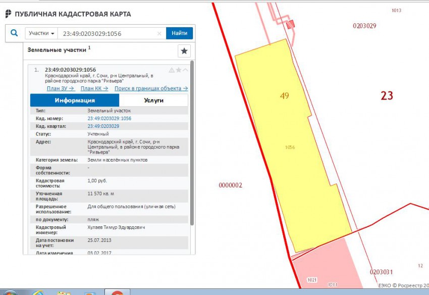 Я полагаю, что речь идет о прихвате городского пляжа «Ривьера» (муниципальная собственность, дата постановки на кадастровый учет -18.07.2013) от бетонной стены до кафе «Сочно».