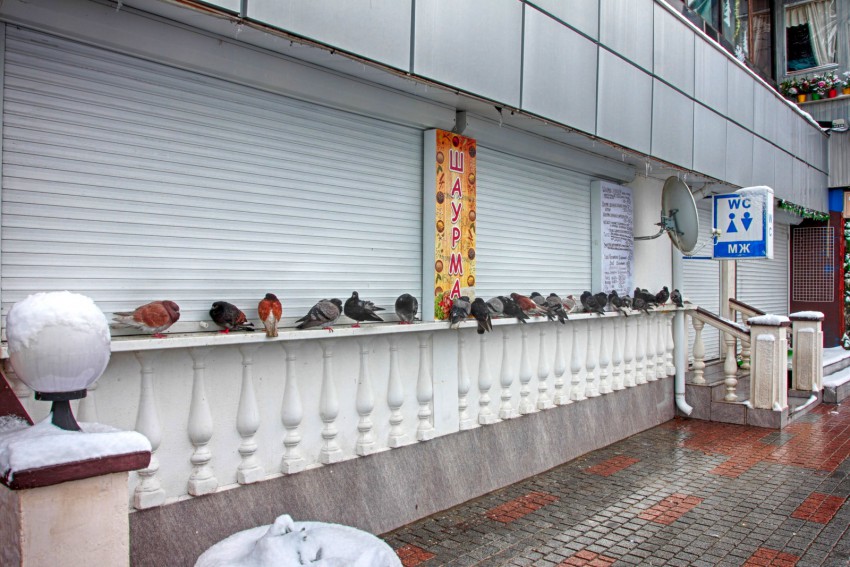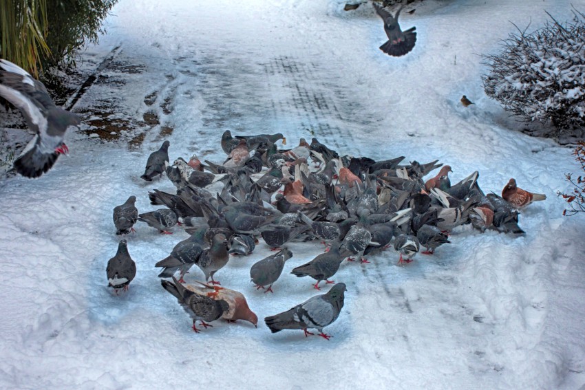 Птицы ждали корма и даже не пытались улететь, люди их беспокоили меньше, чем холод: