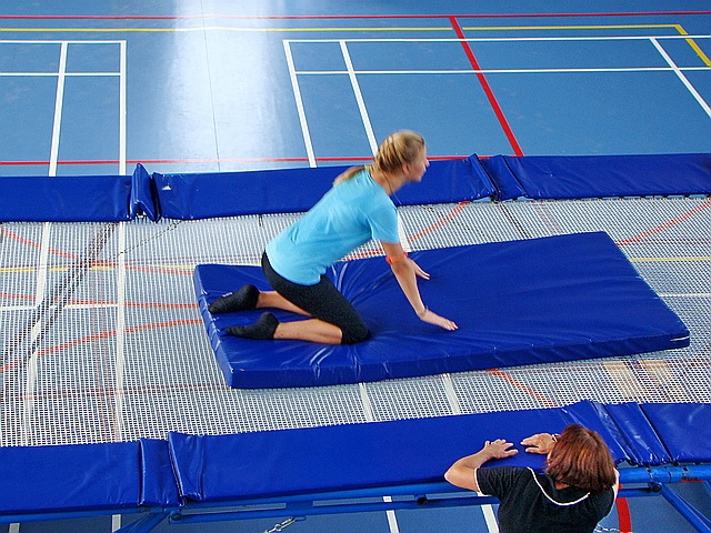 Директор школы узнав, что я пишу для сайта Привет Сочи, согласился провести экскурсию по залам и помещениям спортивного учреждения. В зале для занятий на батуте, отрабатывались прыжки с переворотом.