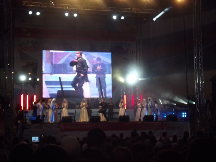 Сцена, наконец стояла в правильном месте и трансляция на экран придавала оптимизма тем.кто не смог близко подойти к сцене.Звука было достаточно и он был хороший.Так как кибитки с извечной жратвой и поднадоевшими запахами шашлыка и плова стояли немного в стороне, то можно было не обращать внимание на количество уже в усмерть пьяных особей:))Пробравшись на освободившийся стульчик я приготовилась вкушать «апогей культуры».И тут началось самое главное.Сначало были танцы, потом песня на английском языке, потом танцы, потом Шнитке в обработке, потом танцы, потом акробатический этюд, потом танцы.потом Вивальди-Пьяццолла в обработке, потом танцы, потом еще раз танцы… При виде полуголых танцоров при температуре +9 у меня стало слегка лихорадить от холода.На освобождавшиеся стулья усаживались подвыпившие гастарбайтеры.Полуголые девицы им очень нравились.Танцы всё продолжались. В 21.15.на сцену вышли дети с танцем «Вальс цветов»одеты они были, как то по летнему.Я пыталась понять, что это было? Всё во общем то напоминало корпоративную вечеринку.И даже репертуар показался знакомым.Только не хватало столиков и уютного ресторанчика:))И почему все эти камерные номера рассчитанные на небольшое помещение были представлены, как Гала-концерт? Окончательно замерзнув и насмеявшись вдоволь, я пошла на остановку.Праздник удался:))Спасибо.
