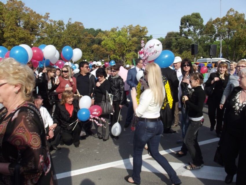 Сначала пустили мотоциклы и мопеды, да за ради Бога, и для чего? и что Они этим хотели сказать? Молодежь быстро сруливала в макдональс"… я едва успел до массового наплыва подростков в 11 ч..", старшее поколение «на своей волне»- как бы в колонне, а общаемся между собой. У многих мужчин в сумках, пакетах бухло открытое-чтобы легче шлось. Безумный комментатор( какой идиот писал ей текст? видимо сразу на 2 праздника и очень шаблонно( для комментатора расшифрую это слово — ТУПО и ТРАФАРЕТНО ), по типу записей на рынке… очэнь обалдэнно сладкие (груши, яболки, пэрсики и так далее). Администрация широкой толпой(колонной это не назовешь) важно гуляло впереди всех.