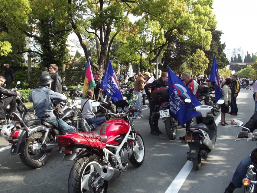 Во-первых, так повелось, что 1 мая – официальное открытие мотосезона в Сочи и многие мотоциклисты приехали к Зимнему театру именно с целью участвовать в символическом мотопробеге, посвященном этому событию, а не поддержать какую-либо из партий.