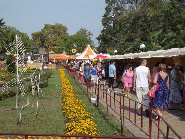 Цены не сказать, что невысокие, обычные для Сочи, да и народу пока не очень много. Хотя те кто есть активно торгуются с продавцами выбирая товар, а потом идут фотографироваться на фоне домашних животных из папье-маше и на телеге с овощами в «Борщевую».