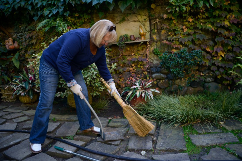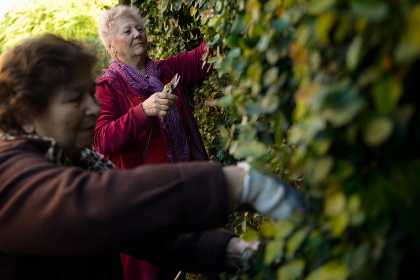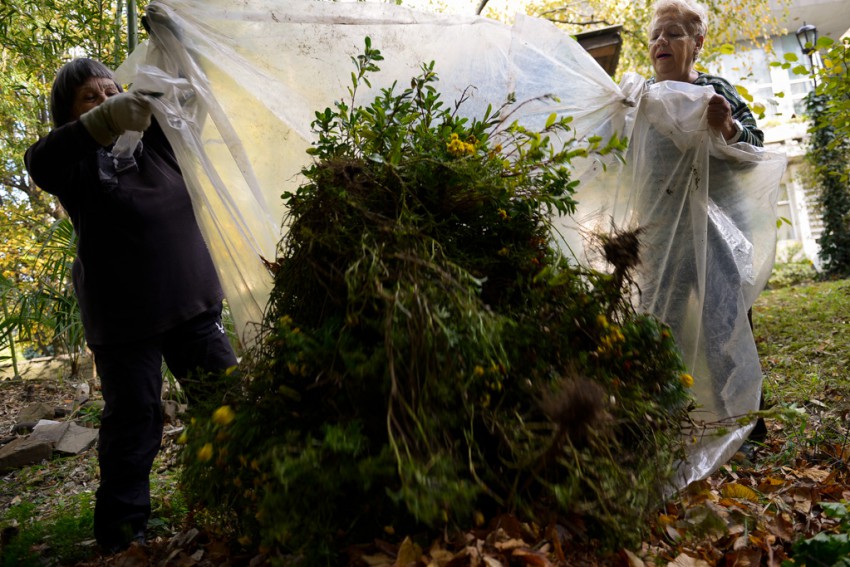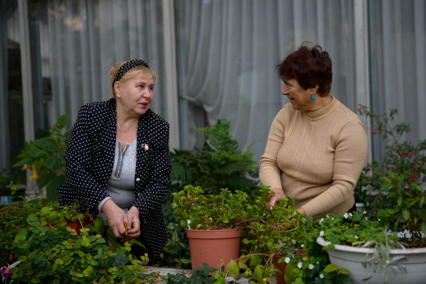 Уголок «Фитофантазия» готовится к зиме. Надо убрать и подрезать сухие ветки. Серебряные волонтеры всегда готовы оказать помощь.