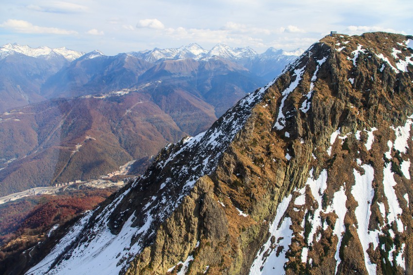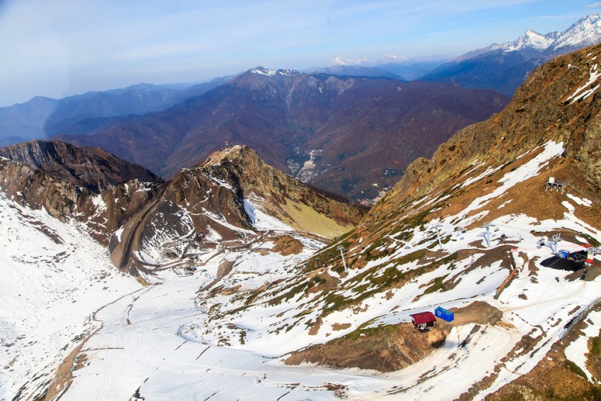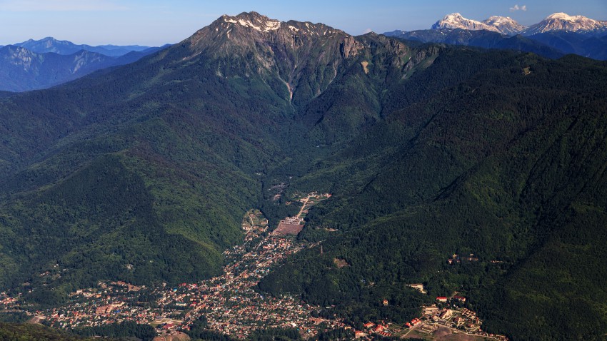 Вид со стороны Красной Поляны, видна примыкающая к трамплину трасса для лыжного двоеборья (Олимпстрой), вдалеке горная олимпийская медиадеревня — Горки Город (Сбербанк):
