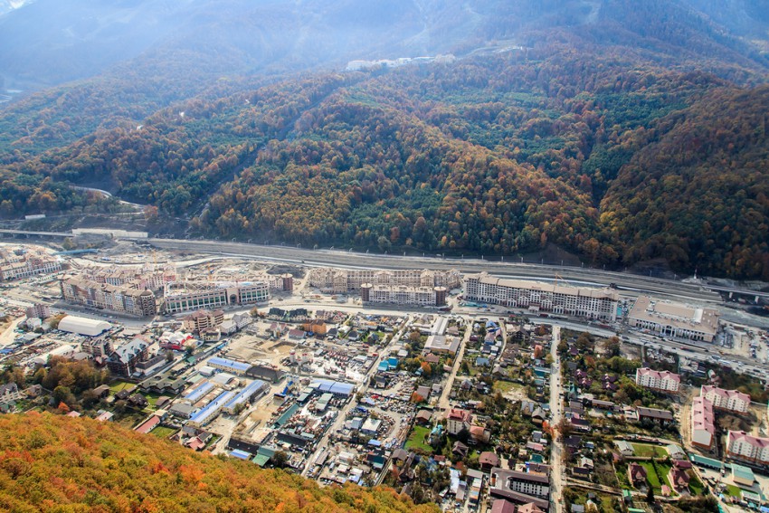 Горки Город на отметке +540 метров над уровнем моря. На переднем плане — пятиуровневый горный вспомогательный медиацентр (после ОИ — конгресс-центр), на заднем плане ТРЦ Горки Город Молл: