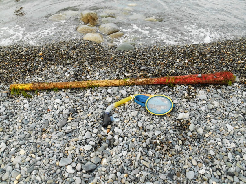 Мой утренний улов. Очень странное, разбитое обросшее ракушкой, весло, которое я нашел на дне.