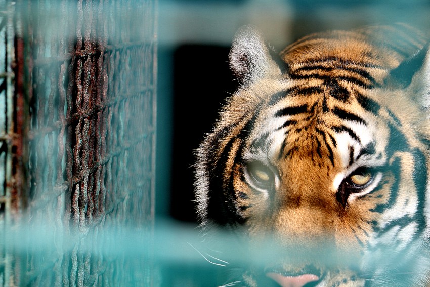 Тигры… Ну для меня тема особая, спасибо моим татуировкам. Батыр спит где-то в глубине своего вольера, Багира трогательно скучает по нему.Вечером она будет ждать мясо, а он метить все углы и тянуть морду в ее сторону.Женщины.))