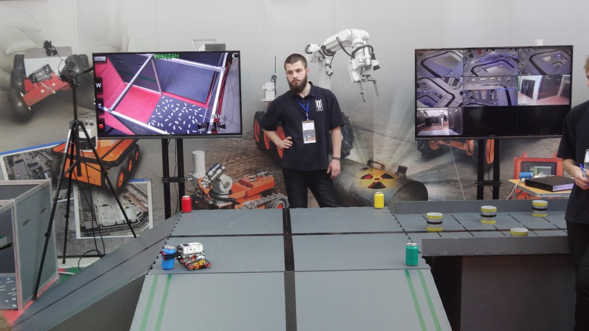 Условно выстовочные образцы можно разделить на статичные экспонаты и остальные — бегающие, ползающие, катающиеся образцы, с которыми посетителям можно что-либо делать. Тут детвора разбирает с помощью манипуляторов робота всякие объекты по углам поля: