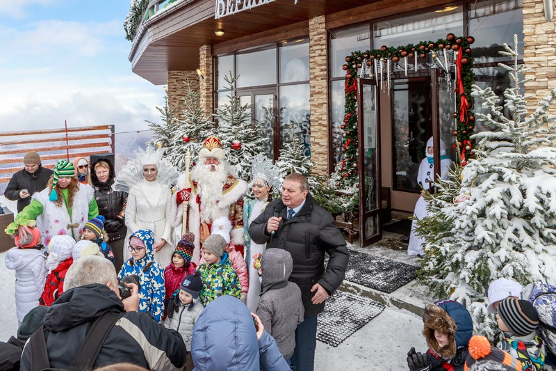 На высоте 2200 метров, где разместилась «Вершина Деда Мороза», гостей встречали Дед Мороз, Снегурочка и оркестр Снеговиков. Наш мэр поприветствовал гостей, пообщался со сказочными персонажами и, вместе с Дедом Морозом и Снегурочкой, вручил подарки детишкам.