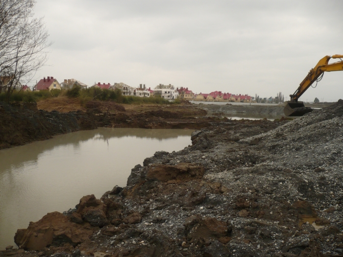Грубо — порта нет, а стройматериал нужно доставить на берег. Берём огромный шланг и качаем. Чтобы грунт проходил по шлангу вместе с ним идёт большое количество воды. Естественно морской — бо другой в море просто нету. Естественно всё это тупо выливается на берег (см. фото отстойника выше), затем стройматериал вывозится. Что будет с дополнительно обогащенной солями (из транспортируемых горных пород) морской водой — догадайтесь сами.