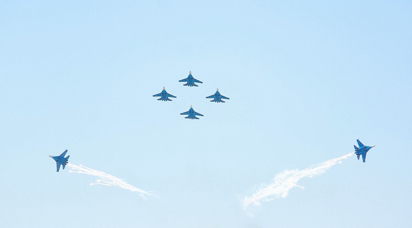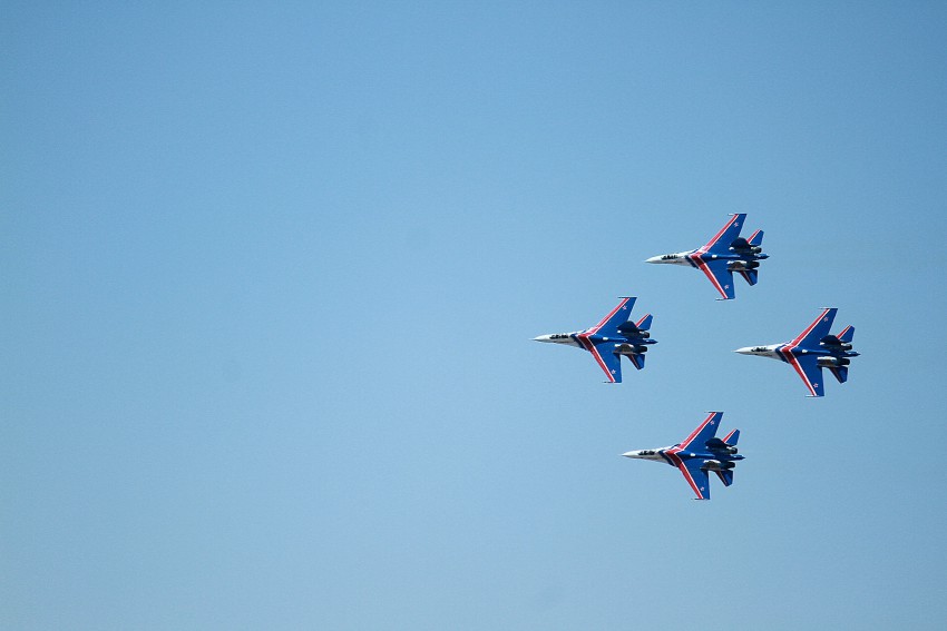 К сожалению, заявленные ранее стратегические ракетоносцы Ту-95 МС, они же «Медведи», к полетам не были допущены и поэтому их прохода мы так и не увидели. Грустно. Никак не могу запечатлеть в воздухе этот самолет.