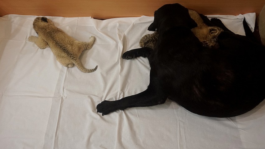 В неволе хищники крайне редко выкармливают свое потомство, обычно сразу отказываясь от него. На этот раз приемной мамой для котят стала Грона, черный лабрадор.