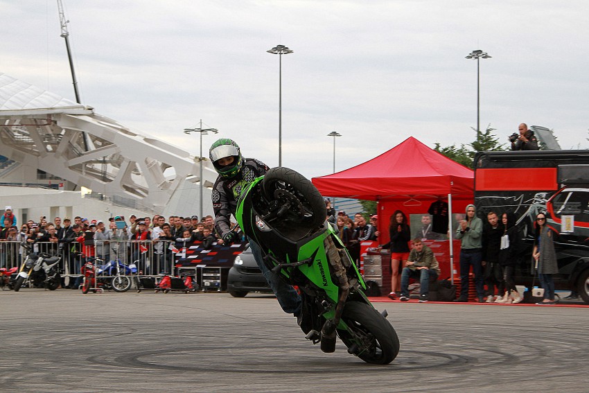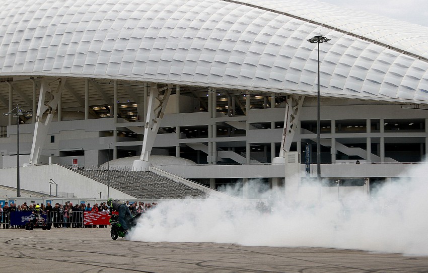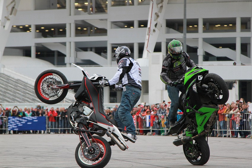 Но с другой стороны, на фоне белоснежных конструкций стадиона «Фишт» в стадии реконструкции вставшие на дыбы мотоциклы смотрелись довольно органично.