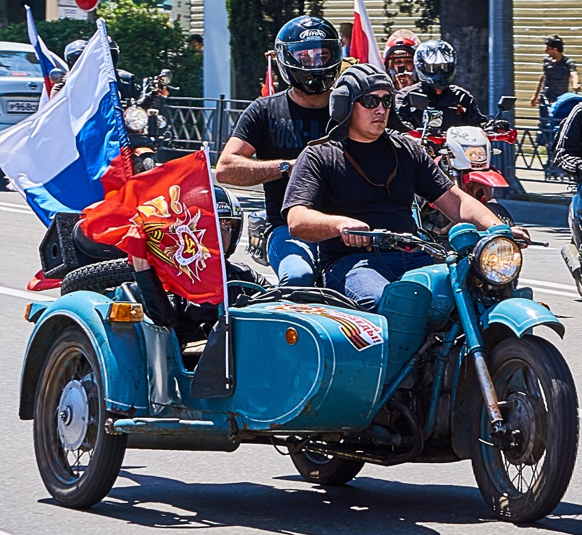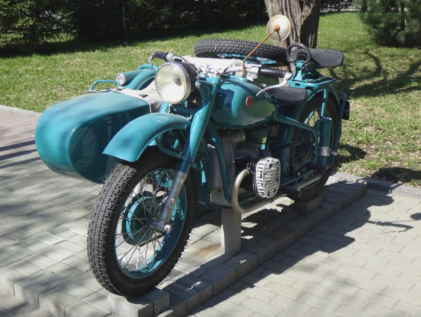А вот синий и зеленый — эх, с другой стороны бы глянуть… Двигатель не разглядеть, явно не Урал, но все-таки и не М-72/К-750. По-ходу сборная солянка из Днепров разных моделей и Урала.