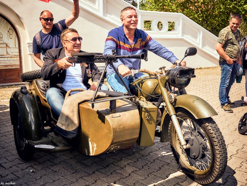 Мотоцикл был доступен для фото всем желающим, а задача “чуваков” была удачно передать эмоцию праздника. И вроде неплохо получилось. Но не это главное, мне больше был важен сам мотоцикл. Когда-то у меня был с коляской, и воспоминания самые теплые. Пройти мимо этого чуда я не мог… А с красноармейцами он есть на первом фото