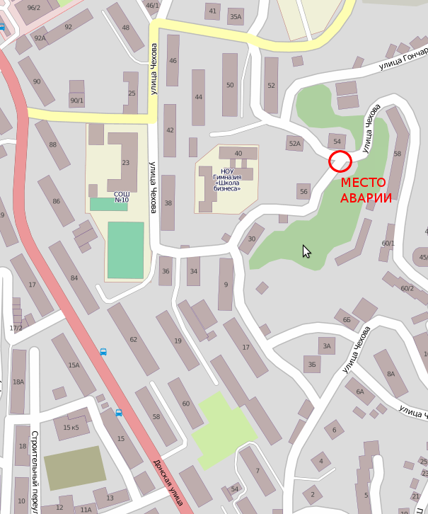 На этот раз улица Чехова. Перекрёсток выше домов 54 и 56.