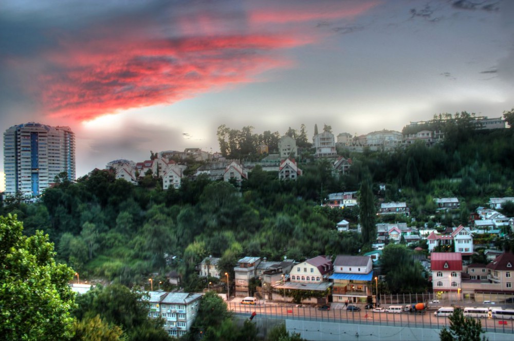 с горизонтом тут почти все впорядке какраз… (посмотрите на высотку), просто дорога как-бы отдаляется в левой части от меня (ущелье к морю расширяется) из-за этого кажется неровной… если ее сделать горизонтальной то «упадет» высотка :) а на счет крана да… живем на стройке практически… и вся эта хрень портит не только пейзажи но и экологию убивает… вспоминаю время когда (в 90-х годах) машину нужно было мыть только после второго а то и третьего дождя… а сейчас… хоть вообще не мой… сразу грязная становится…