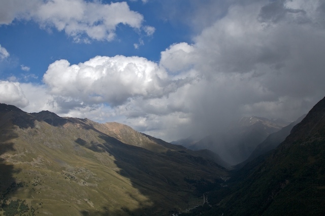 вот первое, что нашёл про дождь… только тут более усложнённый вариант: на уровне моей точки съёмки идёт снег, внизу по ущелью — дождь, а слева вообще солнце… будет время найду ещё что-нибудь про дождь…