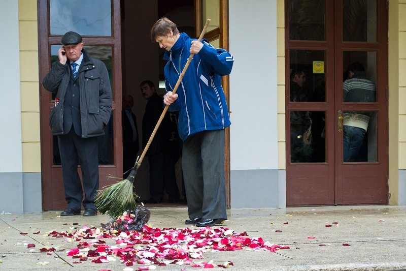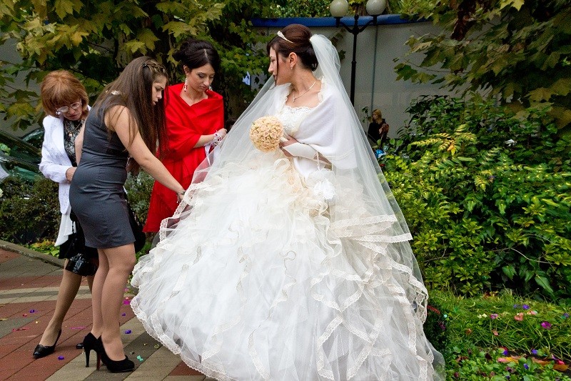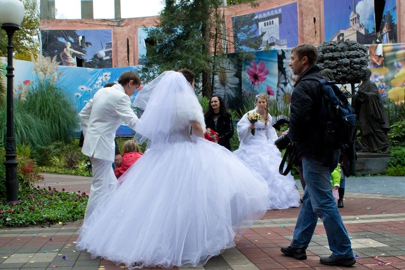 Молодоженов около ЗАГСа было необыкновенно много. Пары сменялись как на конвейере, уж простите за такое неромантическое сравнение, все пришедшие, а коих было предостаточно спешили отыграть свою церемонию у ЗАГСа и отправиться далее по своим свадебным делам.