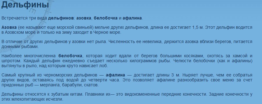 Черное море населяют три вида дельфинов (зубатых китов). Самый крупный бутылконос, или афалина. Поменьше — белобочка и самый маленький дельфин — морская свинья (пыхтун, азовка, чумка). К передвижению в воде приспособлены гораздо лучше рыб. Передние плавники служат дельфину рулями глубины, поворотов и тормозами. Горизонтально расположенный хвостовой плавник не что иное, как мощный гребной винт, благодаря которому дельфины достигают крейсерских скоростей, подолгу сопровождая и даже перегоняя морские суда. Скорость их передвижения может достигать 60—68 км/час.