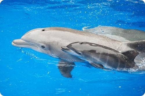 Этого дельфина прозвали морской свиньей из-за толстого, до четырех сантиметров, подкожного жира и шумного дыхания, похожего на похрюкивание. Самки, достигшие четырех лет, почти каждый год в конце весны — начале лета, спустя 9 — 11 месяцев после зачатия, приносят одного детеныша, который появляется на свет хвостом вперед и должен тут же подняться на поверхность для первого вздоха. Длина новорожденного 82 — 86 см при весе 3 — 8 кг. Мать кормит его в течение 4 — 6 месяцев, впрыскивая молоко плывущему рядом сосунку под большим давлением. Дельфин азовка, морская свинья. Дельфины Черного моряКстати, жирность молока обыкновенной морской свиньи достигает 46%.