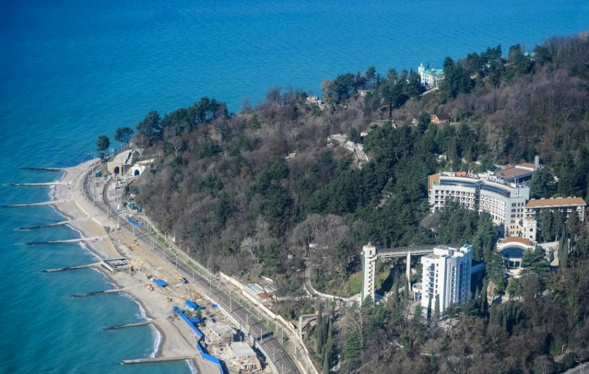 Табличка выглядит полным недоразумением, после того, на что теперь похож склон мыса: прямо у тоннелей лагерь с висящим бельём и костром, по всей пляжной полосе, отсыпанной между новыми волнорезами крупной острой галькой, идёт какое-то строительство. Подпорную стену сделали шириной 50 см, ходить там теперь мягко скажем, — неприятно, и небезопасно. От красивейших сосен, нависающих над морем, остались жалкие остатки. С вертолёта это выглядит теперь так.