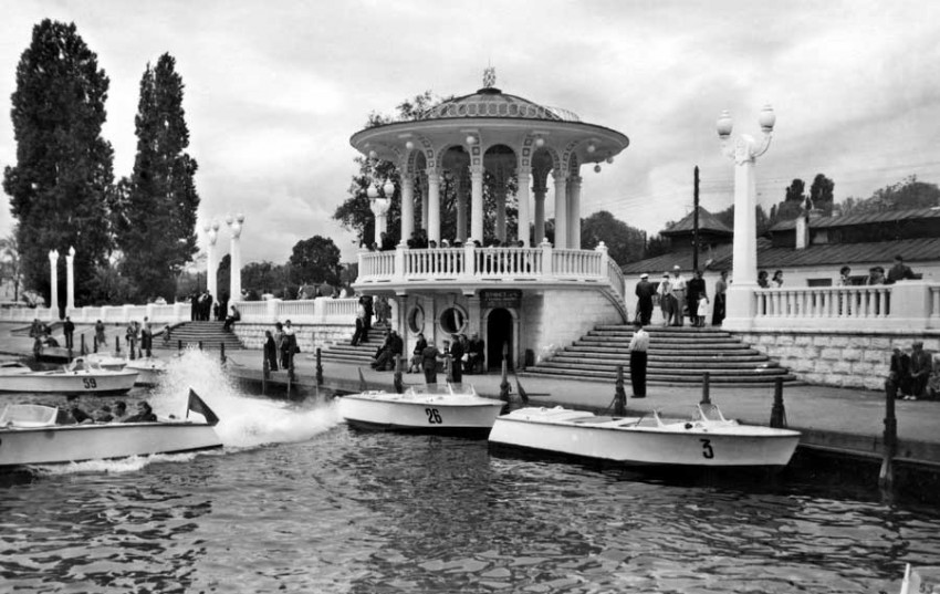Очень вкусная панорама тоже конца 50х на самый-самый центр Сочи:)) с ещё не благоустроенной приморской набережной, на морвокзал, вступивший в строй в 1955 году:) — видна часть знаменитого Сочинского бродвея, да вообще — об чём тут грить, всё и так просматривается