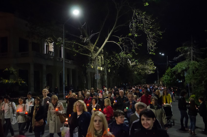Как-то незаметно для ПриветСочи прошла акция «Свеча памяти», которая проходила 8 мая 2015 года в 20.00. Тысячи сочинцев прошли от Северного мола к Южному по улице Несебрской с зажженными свечами в память о героях Великой Отечественной войны. Вот немного моих фото.