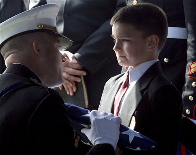 Восьмилетний Кристиан принимает флаг во время поминальной службы в честь его отца, убитому в Ираке всего за несколько недель до дня возвращения домой.