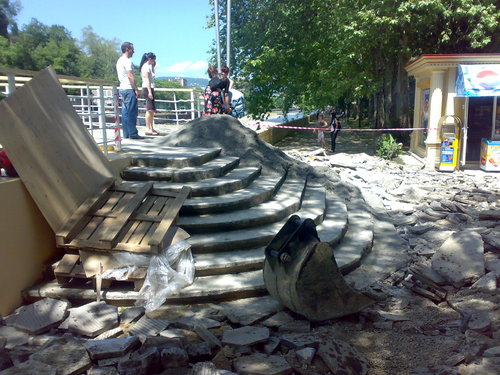 И действительно так и было. Кроме того получается все пешеходы движущиеся по мосту попадают напрямую в огороженную зону стройки. Наблюдал картину как родители на руках тащили коляску с ребенком, перепрыгивая через огромные куски порушенного бетона и плитки!