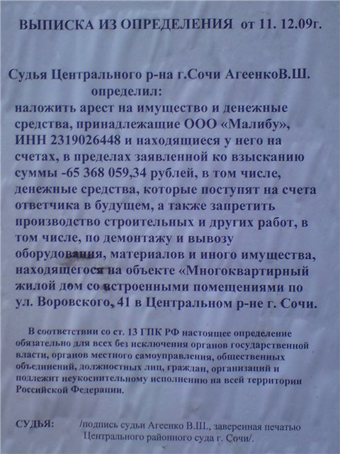 Вкладчикам средств в указнный дом необходимо начинать шевелиться уже и я бы рекомендовал идти и добиваться возврата денег. Готов помочь)))) У меня там тоже одна как оказалось, не богатая знакомая вложила деньги. Сейчас ногти кусает, боюсь, как бы все не съела от нервов. Особенно радует, когда проходишь возле здания, а там даже кран полуразобранный. Мысли лезут самые «позитивные». Простите за сарказм: «Поздравляю Вас с новосельем в сданном в эксплуатацию доме».