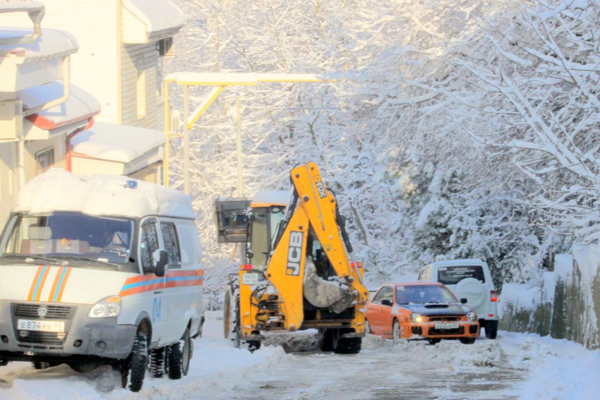 Все сотрудники корпуса управления ОАО«Сочигоргаз» во главе с главным инженером расчищают от снега дорогу.