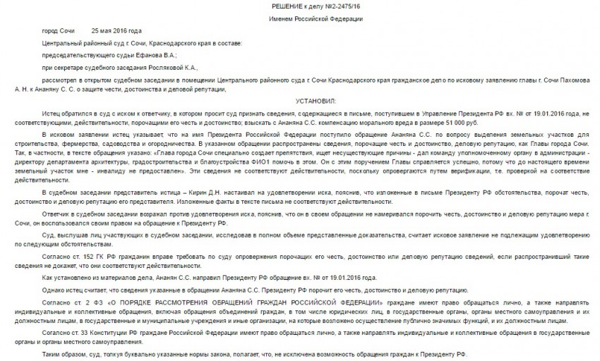 Суд решил: имела место реализация гражданином А. своего конституционного права на обращение в подопечные президенту органы, которые в силу закона обязаны проверять поступающую от таких граждан как А. и им подобных информацию о возможных злоупотреблениях с мест. А проверять информацию на предмет, порочит ли она репутацию мэра Сочи или нет, в обязанности чиновников аппарата администрации президента — НЕ ВХОДИТ!