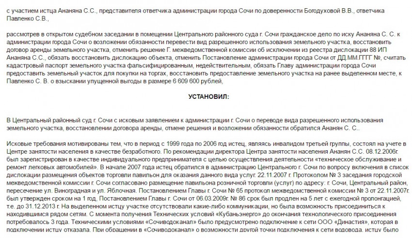 В частности, гражданин А. пишет: «Глава города специально создаёт препятствия, ищет несуществующие причины — дал команду уполномоченному органу в администрации — директору департамента архитектуры, градостроительства и благоустройства (редакция ПриветСочи располагает фамилией и всеми необходимыми документами в связи с этим) помочь в этом. Он с этим поручением главы города справился успешно, потому что до настоящего времени земельный участок мне — инвалиду — не предоставлен».