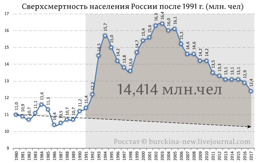для понимания коммуняцкого «при ельцине -20 млн!!!» за довоенные сталинские годы 1927-1941 в союзе по официальным данным умерло суммарно больше 42 миллионов человек…