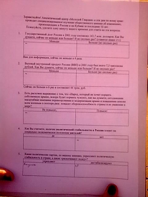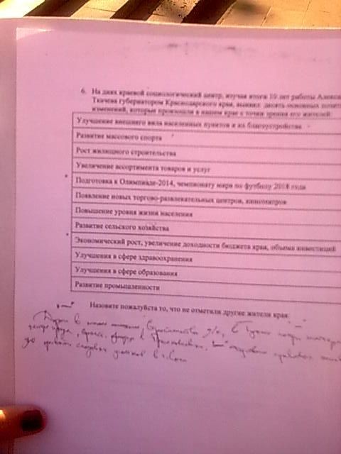 Я тоже включился в процесс ответов на анкету. Клянусь, что ни одного положительного отзыва о деятельности ЕР, администрации Сочи и Краснодарского края по крайней мере в Лазаревском районе, никто из нас троих не дал. Что она написала и какие отметки сделала в этой анкете узнает только её руководство в МГ (в г. Краснодонск?)!