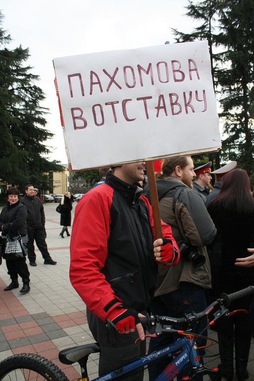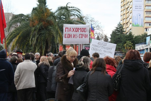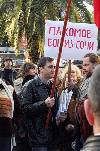 На плакате написано: Сочинцы! Сохраним курорт для народа! Люди орут: ПА-ХО-МОВ!!!