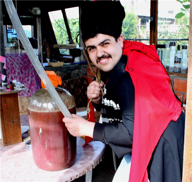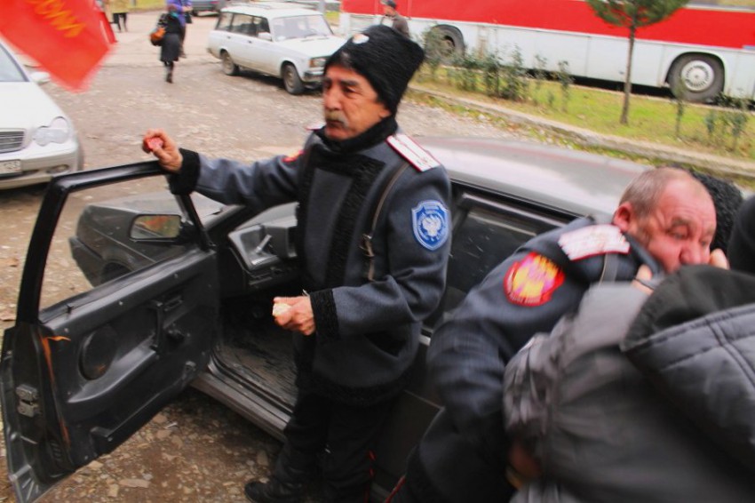 Когда организатор и журналисты обратились к группе граждан, напоминавших чиновников (злые взгляды, в руках камеры и фотоаппараты, на нескольких дорогие олимпийские куртки Bosco), чтобы узнать, кто здесь старший от администрации и почему площадка заставлена авто, старшим неожиданно назвался мужчина в папахе и бешмете. Бравый казак неопрятного вида, оказавшийся целым хуторским атаманом, держал в руках… Нет, не нагайку с шашкой. А колбасу и корку хлеба. Шкурка от жадно поедаемой колбасы даже прилипла к губе «старшего». При этом атаман стал требовать, чтобы его не снимали, и сальными руками начал хвататься за объекты профессиональной видеокамеры и фотоаппарата. Когда Абрамян попытался урезонить дебошира, на помощь последнему прибежали мужчина в куртке Bosco, попытавшийся отобрать камеру у главного редактора телепрограммы «Советская Кубань» Вячеслава Потапова, и схвативший коммуниста со спины второй атаман. Без колбасы, но с бородой. Примечательно, что третий казак, обедавший у водительской двери автомобиля, видимо, забыл о «лыцарском братстве» и спокойно продолжал жевать хлеб, когда два атамана и чиновник пытались скрутить оппозиционера. Кстати, мужчина в Bosco, как потом сообщили местные, является сотрудником пресс-службы администрации мэра Пахомова.