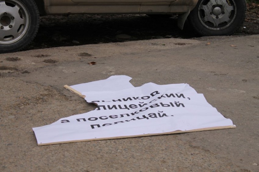К моменту, когда заявления участников конфликта были приняты, на площадке стали собираться жители. Всего на митинг пришло более ста человек – для маленького Лоо это приличное число участников. Правда, спустя полчаса здесь же появились в сопровождении полицейских неизвестно откуда взявшиеся парни, которых местные не знают в лицо. Они стояли отдельной кучкой, исподлобья глядя на митингующих. Один из них после разговора с короткостриженным мужчиной в штатском (которого сочинцы опознали как сотрудника уголовного розыска) подбежал к гражданским активистам и порвал плакат «Мельников – не полицейский, а поселковый полицай». Единственным аргументом немногословного нарушителя стало: «Вы че их трогаете? Они реальные пацаны!». Как-либо реагировать на порчу чужого имущества и хулиганские действия своих подопечных полицейские просто не захотели.
