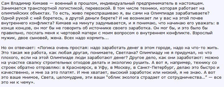 Кимаев не спасает, Кимаев сотрудничает и зарабатывает: «что плохого, если на этой Олимпиаде люди заработают денег? Эти ваши „облик эколога страдает от сотрудничества..“ — все это ни к чему»