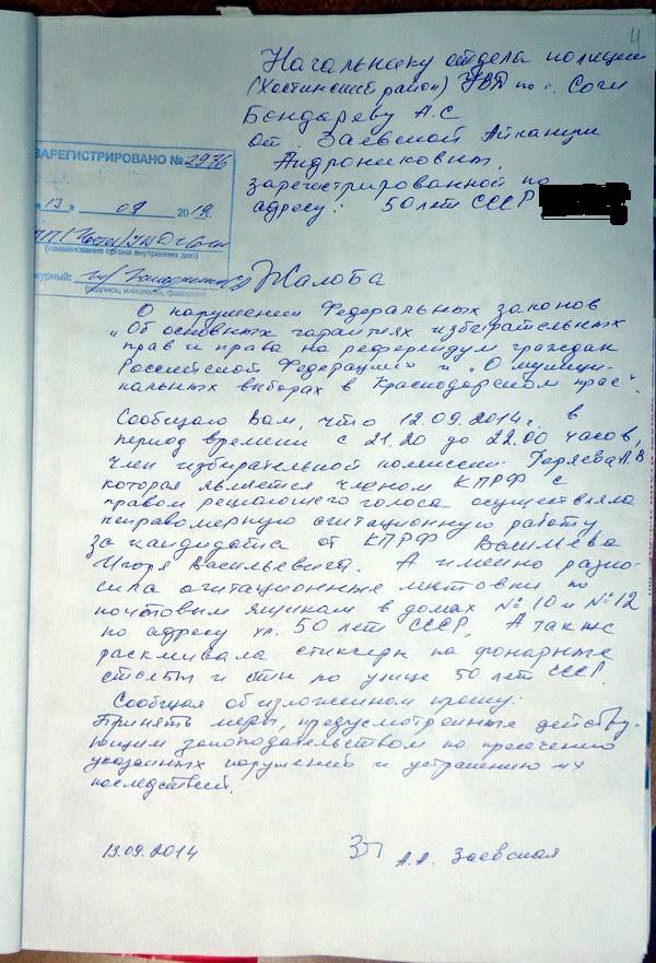 В ходе прошедшей в августе-сентябре мэрской мерзкой выборной кампании в Сочи гражданская активистка Людмила Горяева была подвергнута мировым судьей административному наказанию в виде штрафа 1500 руб. за якобы нарушения при распространении агитационных материалов. Основанием для вынесения наказания послужил протокол об административном правонарушении, составленный доблестным участковым полицейским опорного пункта ОВД по Хостинскому р-ну. Бдительный полицейский чин «застукал» Горяеву с поличным в момент ужасного правонарушения — размещения агитационных листовок по почтовым ящикам дома, в котором «правонарушитель» Горяева проживает много лет. Злостность её деяния, по мнению полиции, заключалось в том, что она (о ужас!) посмела распространять агитационные листовки вовсе не за единоросса Пахомова, а за самого что ни на есть коммуниста Васильева!