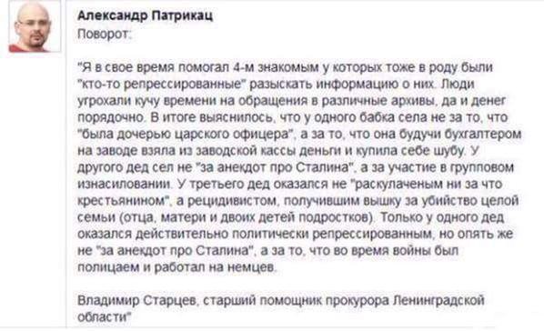 Репрессии были, этого факта никто не отрицает. Но количество репрессий было несоизмеримо мало по сравнению с теми цифрами, о которых врали и врут бывшие диссиденты и западники. Поскольку после Второй Мировой войны стало окончательно ясно, что силой оружия с нами справиться невозможно, они решили по старой англосаксончкой (читай римской) традиции нанести удар изнутри, путем постепенного формирования в стране того, что называется сегодня «пятой колонной» — инакомыслящих субъектов, ориентированных целиком на запад и западные ценности, в идеале русофобов и всёпропальщиков. Для этого заказчикам мероприятия по убийству СССР нужен был миф о «кровавом несправедливом режиме», чтобы разрушить СССР. Действительно — если большое число людей убедить, что они жили и живут при тиранах и тирании, то государство этих людей разрушится само собой. Ведь еще в Евангелии: «если царство разделится само в себе, не может устоять царство то; и если дом разделится сам в себе, не может устоять дом тот». Итак, миф был создан и впихнут в головы бывших совграждан ИМЕННО деятелями культуры и искусства — они послужили передаточным механизмом идеи саморазрушения. Это они писали книжки и статьи в журналах «самиздат» и «Новый мир» — итак, Макаревичи выступили носителями идеи «кровавого режима». Но, несомненно, для развала такой мощной супердержавы как СССР макаревичей было недостаточно — это хорошо понимали на западе, ибо вносимые в головы людей «свежие идеи» нужно было подкреплять суровой действительностью. Помощников нашли быстро — это были те, кто не желал жить честно, объединим их в категорию «торгаши и фарца», не мог реализовать в СССР награбленное, объединим их в категорию «подпольные миллионеры Корейко», ну и естественно, от большого ума властьпридержащие, объединим их в категорию «секретари обкома» (читай Горбачёв). Процесс окучивания населения шёл медленно, ход ему дали после Карибского кризиса, который очень напугал США. Вуаля, в 1991 году СССР не стало, что принесло и до сих пор приносит неисчислимые беды народам Евразии. Но и Россия слишком крупное и неудобное постсоветское образование. Россия по их плану должна быть расчленена на удельные княжества и стёрта как субъект геополитики, природные ресурсы должны быть целиком и безоговорочно переданы под протекторат западных компаний. Стратегию, тактику, носителей идеи и исполнителей на местах избрали тех же. 20 лет стирали и оскверняли нашу историю, впихивали этот паштет из чепухи в головы молодого поколения — и уже было потирали руки. Но, как это всегда бывает в критические моменты истории — появляется некто, который и спасает мир. Итак, в интересное время мы с вами живём ;)