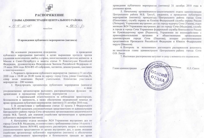 На мой взгляд администрация самовольно изменила место проведения митинга. Поскольку в уведомлении была чётко указана «площадь перед администрацией города», а в распоряжении, приведённом ниже согласовывается уже «сквер, возле памятника первой учительнице». Памятник, кстати, насколько мне известно, установлен сочинскому учителю. Но не суть.