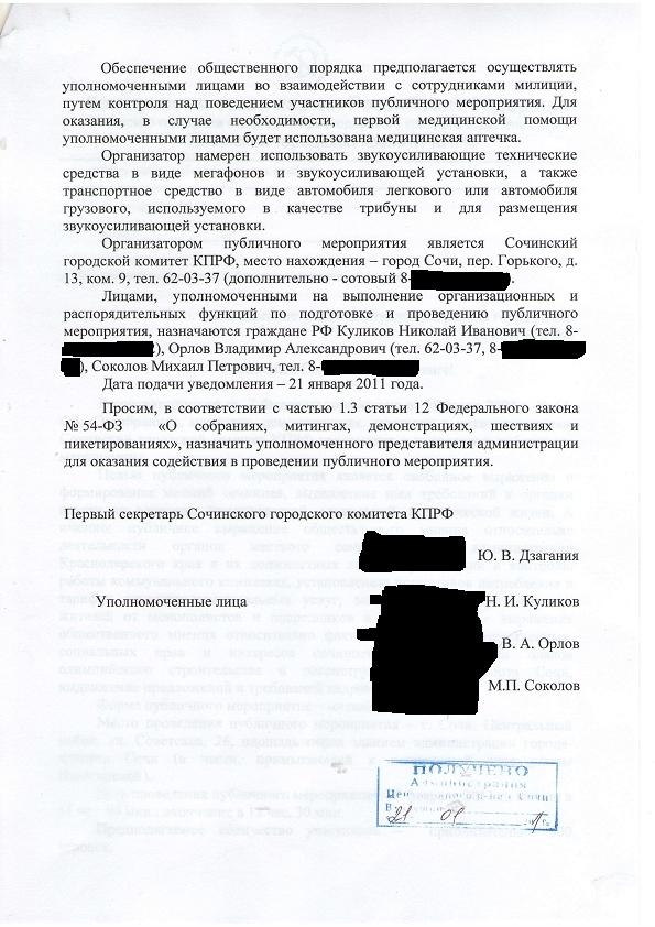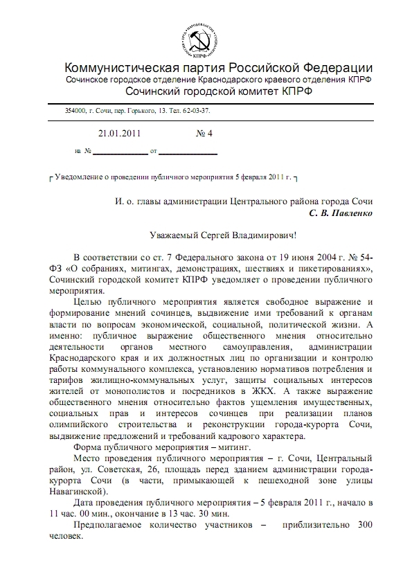 Сегодня, 21 января, сочинские коммунисты подали уведомление о проведении митинга 5 февраля.