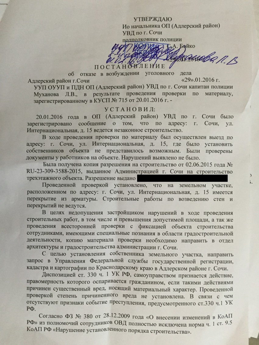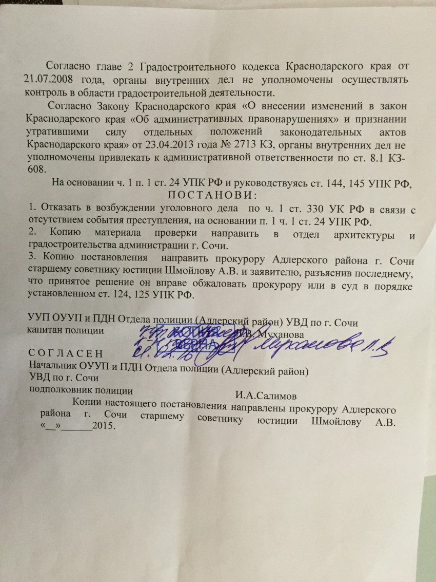 Хотя за несколько дней до этого, Адлерское УВД на наше сообщение о мошеннических действиях прислало отписку: что в возбуждении уголовного дела отказывают, и что вообще градостроительная деятельность находится не в их компетенции (ответ УВД в приложении).