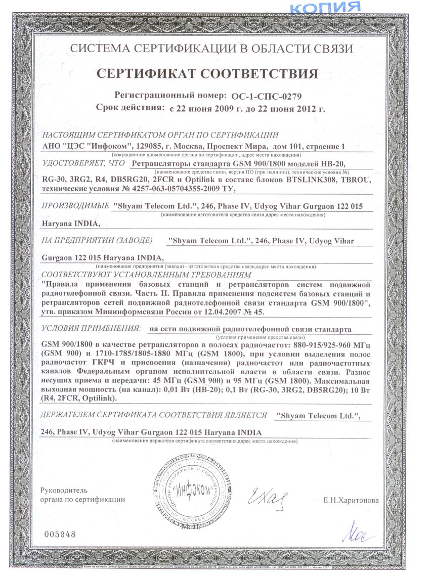 Отечественный изготовитель оборудования для ретрансляции сигналов — ЗАО «Московские микроволны» выдает своим дилерам сертификат соответствия, в котором имеются условия применения ретрансляторов систем подвижной радиотелефонной связи стандарта GSM 900/1800. Согласно этим условиям, применение ретрансляторов возможно только при условии выделения полос радиочастот ГКРЧ и присвоения (назначения) радиочастот или радиочастотных каналов Федеральным органом исполнительной власти в области связи.