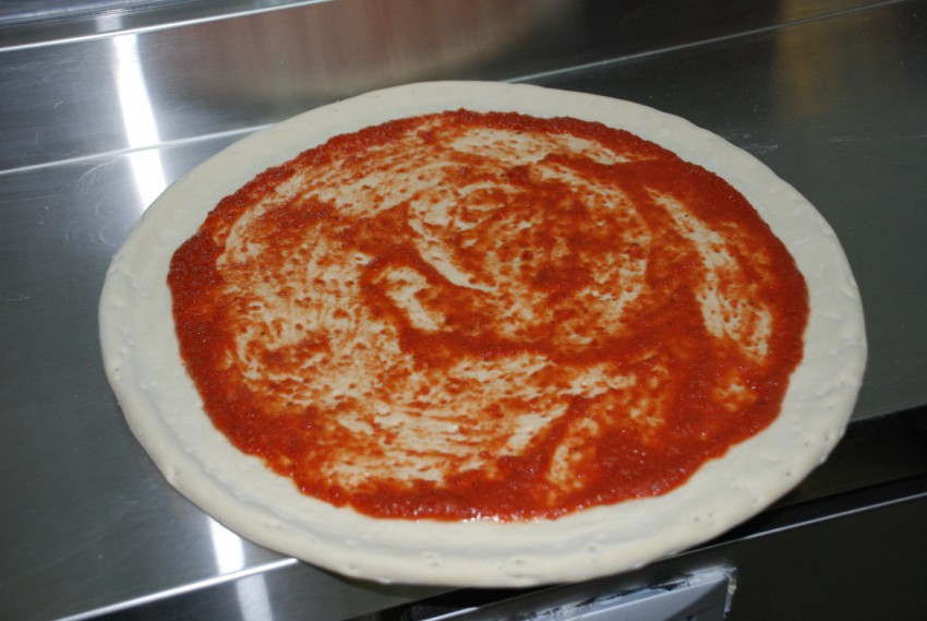 Следующим важным элементом вкусной пиццы, является соус. Мы применяем настоящий пицца-соус, который на 98% состоит из томатов, а на 2% из соли, сахара, базилика и перца.