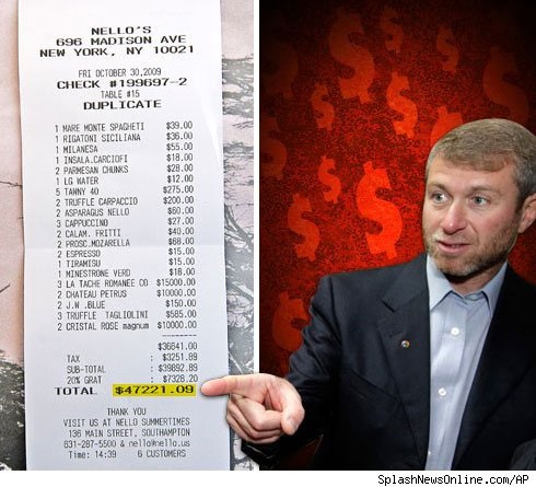 Российский миллионер Роман Абрамович отобедал в компании коллег и партнеров в Нью-Йорке за 52 тысячи долларов.